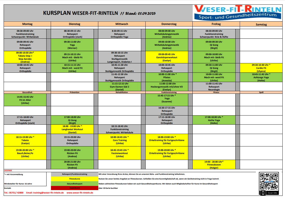 Neben unseren Kursen im Weser-Fit Rinteln bieten wir auch ein umfangreiches Externes Kursangebot in den örtlichen Grundschulen, Sporthallen sowie Schwimmbädern an. Die nachfolgende Tabelle gibt Ihnen eine Übersicht über unser aktuelles “Externes Kursangebot”. Bitte beachten Sie, dass für einige Kurse eine Voranmeldung zwingend erforderlich ist. Diese Kurse sind mit einem * gekennzeichnet.